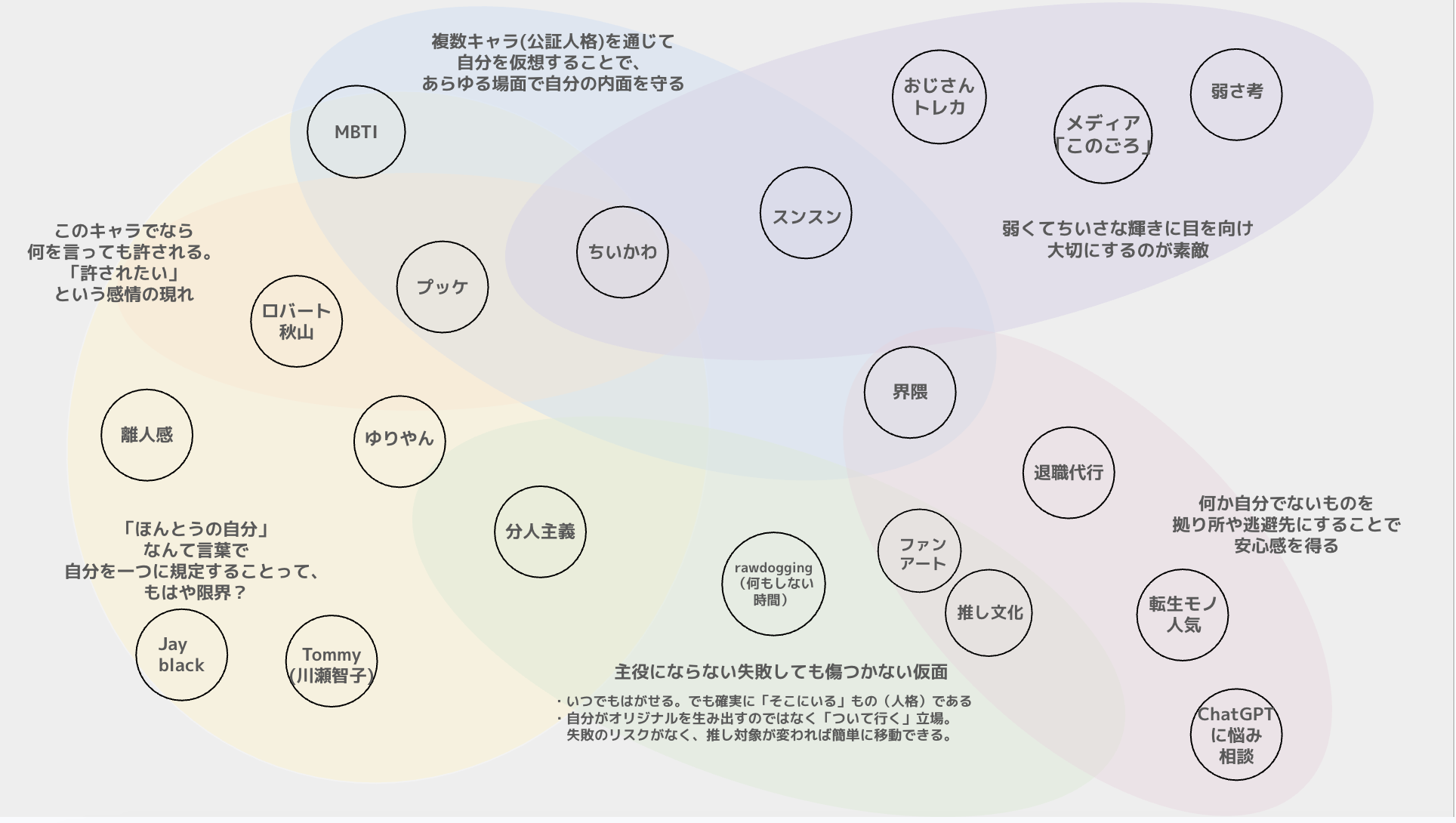 「このキャラでなら何を言っても許される」「許されたい」という感情の現れであり、何か自分でないものを持ち所や逃避先にすることで安心感(安全圏)を得ています。「ほんとうの自分」なんて言語で自分を一つに規定することはもはや限界に来ています。複数キャラ(公認人格)を通じて自分を仮想することで、あらゆる場面で自分の内側を守る「主役にならない失敗しても嘘つきかなり仮面」となっていると言えるのではなかろうか?