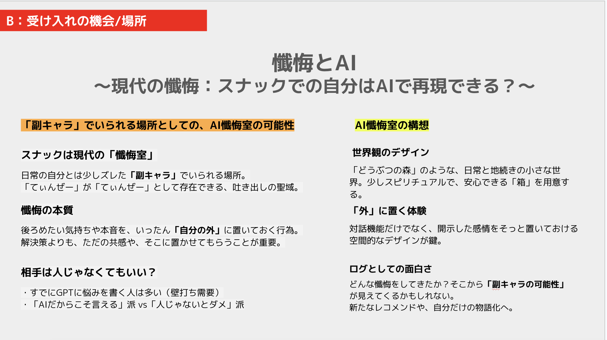 - 懺悔とAI: 「副キャラ」でいられる場所としての、AI懺悔室の可能性(スナックは現代の「懺悔室」)。