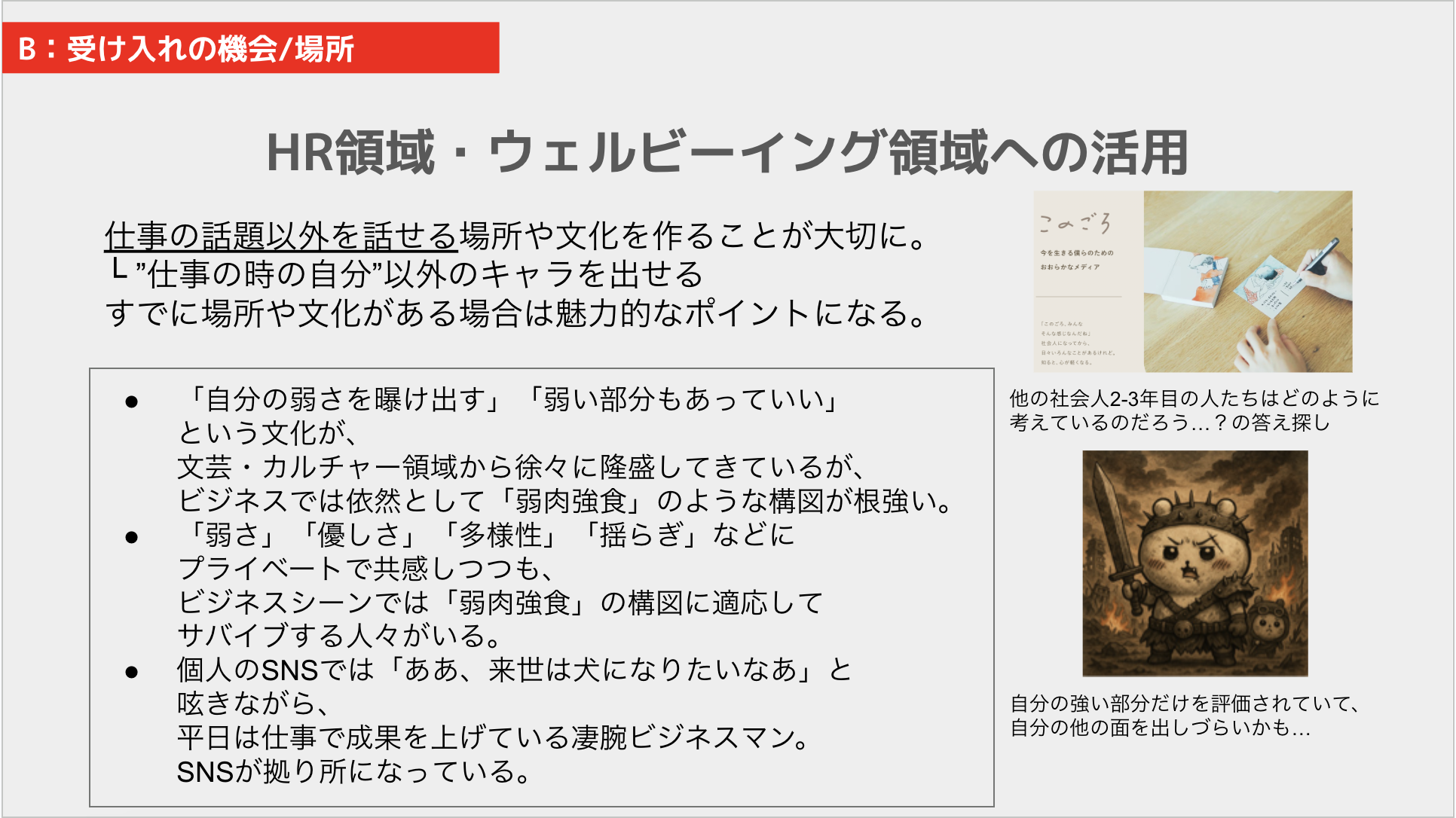 - HR領域・ウェルビーイング領域への活用: 「自分の弱さを曝け出す」文化が隆盛していますが、ビジネスでは「弱肉強食」が根強い状況です。