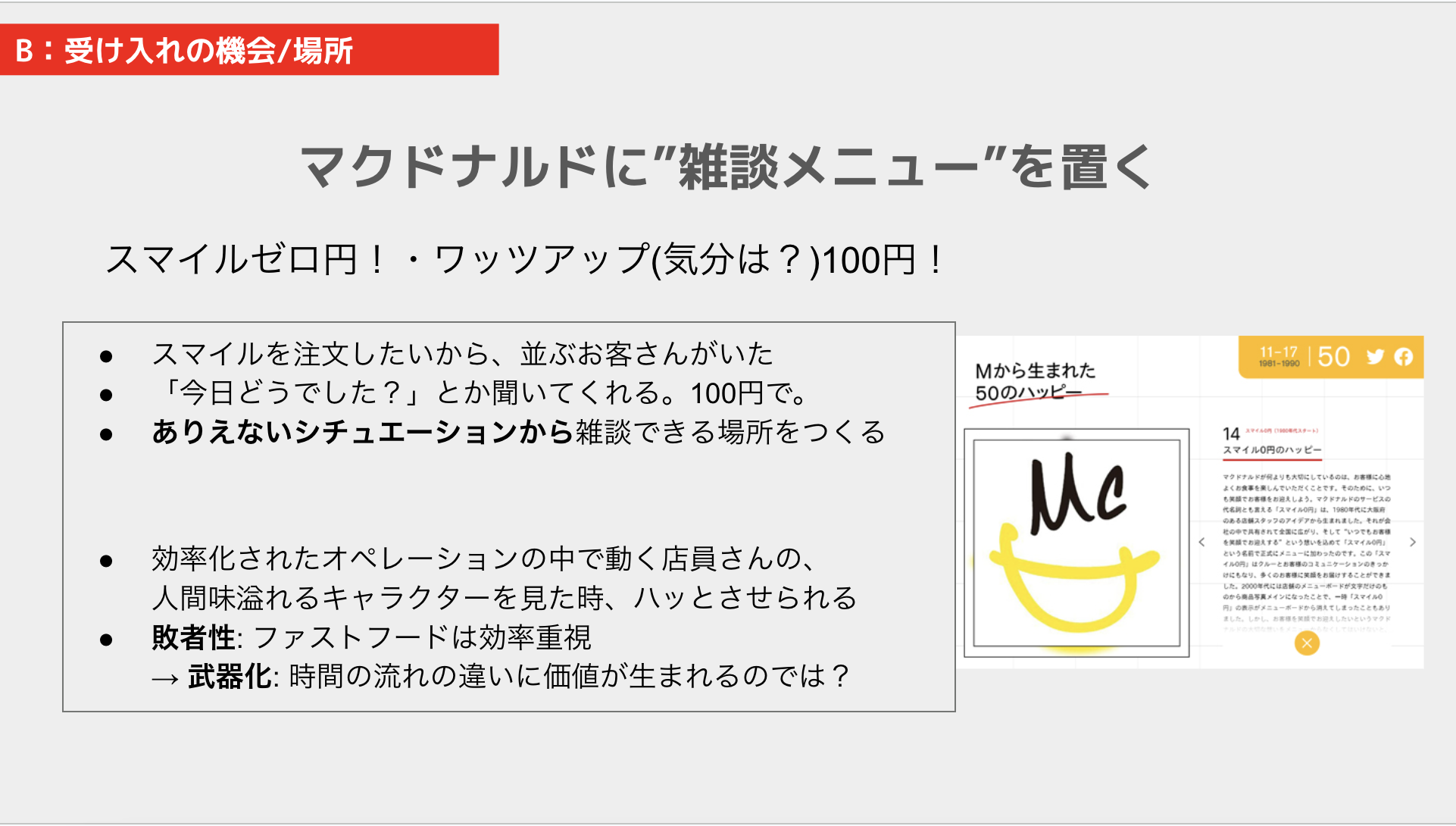 - マクドナルドに「懺悔メニュー」を置く(スマイルゼロ円・ワッツアップ100円): 効率化されたオペレーションの中で人間味溢れるキャラクターを見たときにハッとさせられます。