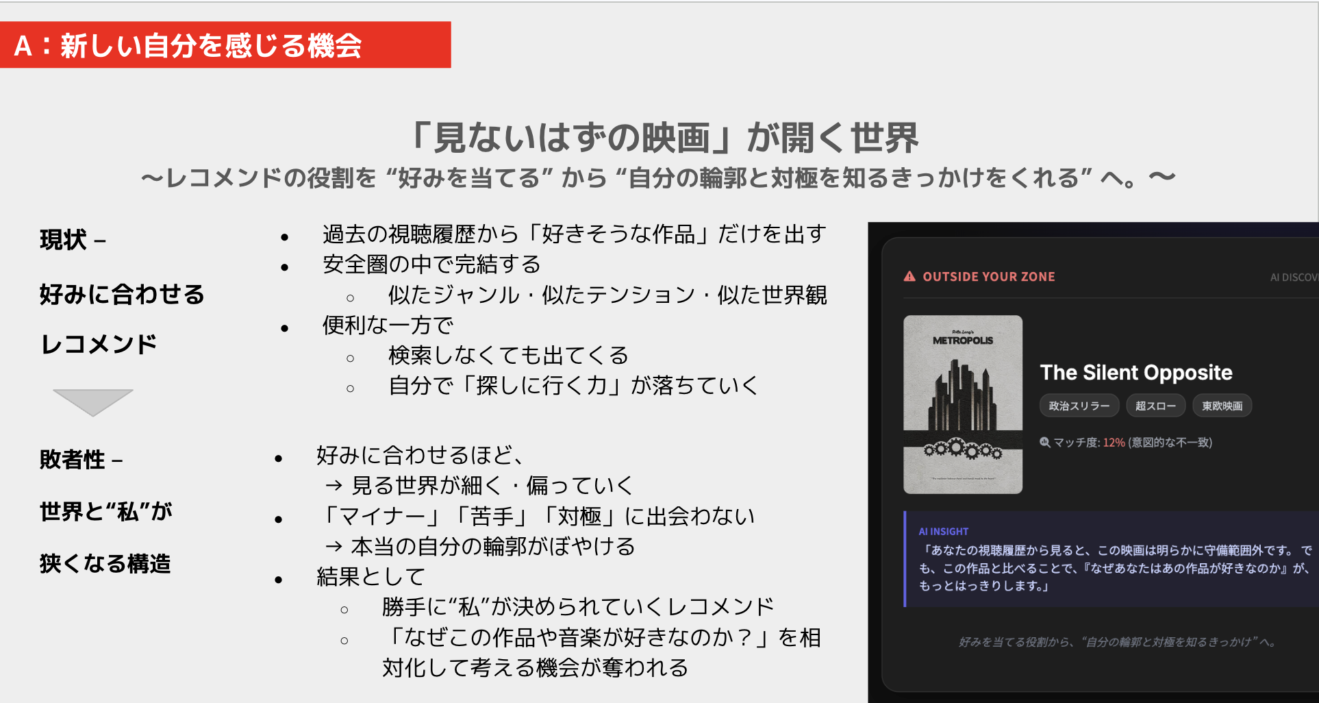 過去の視聴履歴から「好きそうな作品」を提案されることは便利ですが、自分で探しにいく力が落ちるだけなく、観るものの世界観が偏っていくもの。いような人格が自分の中にあるからこそ、「アルゴリズム」に沿った提案は避けたい!と思うはず。(つまり、提案・suggestionは不健全な状態)。「なぜこの作品や音楽が好きなのか?」を相対化して考える機会が与えられ、レコメンド機能によって「マイナー」や「苦手」な「対極」なものに出会えず、執筆に「私」が決められているとも考ええ、だからこそ、**レコメンド機能が 「好みを当てる」から 「自分の輪郭と対極を知るきっかけをくれる」になるといいのでは?**と考えました。