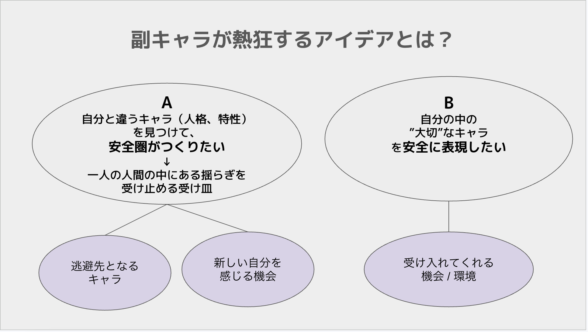 このキャラでなら何を言っても許される。「許されたい」という感情の現れ。何か自分でないものを持ち所や逃避先にすることで安心感を得られる。複数キャラ(公認人格)を通じて自分を仮想することで、あらゆる場面で自分の内側を守ることができます。