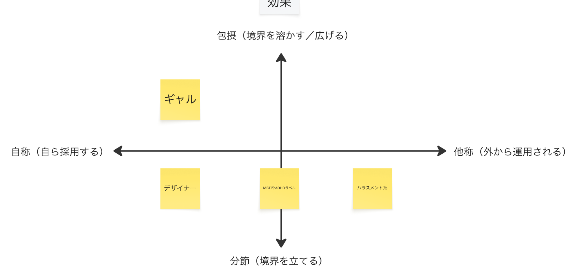 上の図のように整理してみると、包摂型にあたるのは「ギャル」だけで、境界を溶かすタイプのラベル・名付けの特異さが浮かび上がり、雑談の発端となった「ギャル」というラベルに感じた不思議さに戻る結果となった。